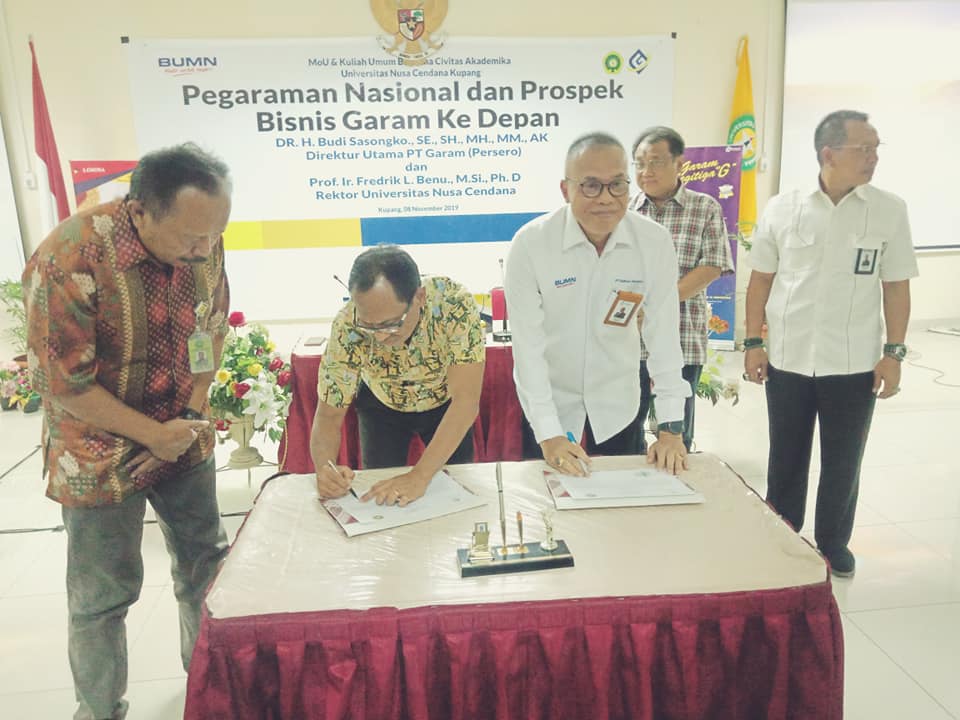 PT Garam (Persero) dengan Universitas Nusa Cendana (Undana), Jumat (8/11), bertempat di ruang aula lantai tiga Undana Penfui, sepakat menandatangani surat perjanjian kerja sama bisnis garam industri dilakukan masing-masing Direktur Utama PT Garam (Persero), Dr.H. Budi Sasongko,SE.,SH.,M.Si.,Ph.D dan Rektor Undana, Prof. Ir. Fredrik L.Benu,M.Si.,Ph.D, disaksikan Wakil Rektor IV, Ir. I Wayan Mudita,M.Sc.,Ph.D dan Pejabat dari PT Garam (Persero). Penandatanganan nota kesepahaman tersebut didahului dengan kuliah umum bersama mahasiswa Undana dengan judul “Pegaraman Nasional dan Prospek Bisnis Garam ke Depan.,”
