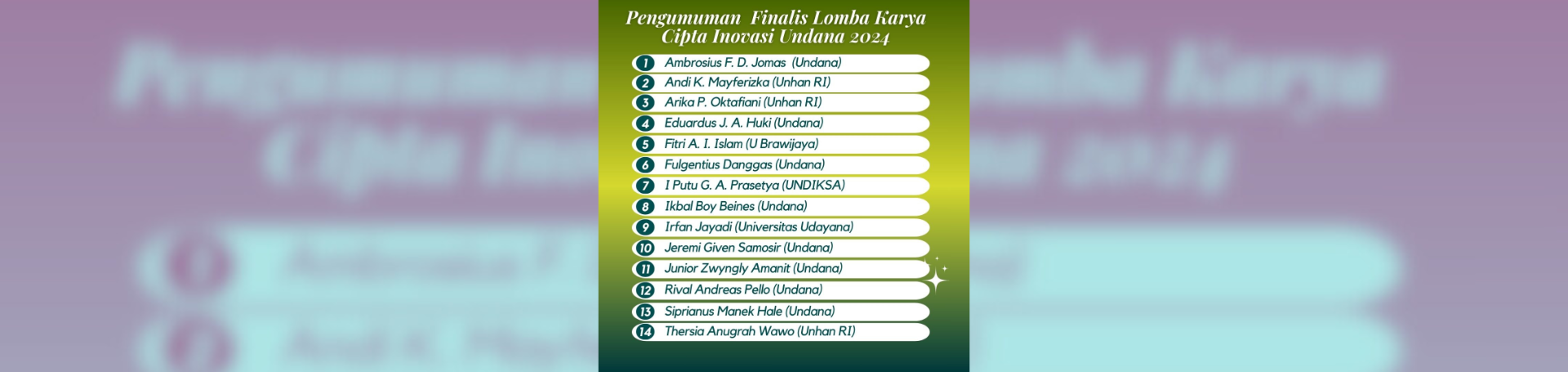 KUPANG – Universitas Nusa Cendana (Undana) mengumumkan 14 finalis dalam Lomba Karya Cipta Inovasi Nasional Undana 2024. Ajang ini menjadi sarana bagi mahasiswa se-Indonesia untuk memperkenalkan inovasi-inovasi yang mereka hasilkan di berbagai bidang.