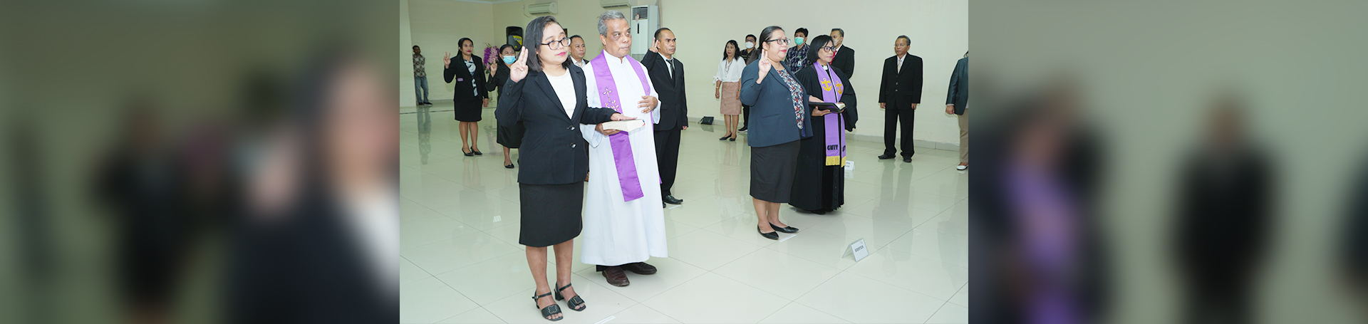 Enam pejabat foto bersama Rohaniawan Kristen Protestan dan Kristen Katolik usai pengambilan sumpah dan pelantikan di Aula Rektorat, Kamis (1/12/2022)