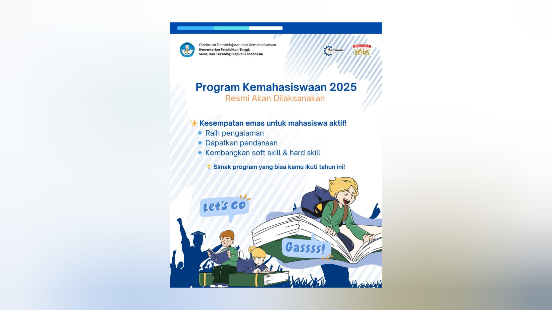 JAKARTA – Direktorat Jenderal Pendidikan Tinggi, Riset, dan Teknologi (Ditjen Dikti) dengan bangga meluncurkan kembali Program Kemahasiswaan 2025. Program ini dirancang untuk memberikan kesempatan bagi mahasiswa di seluruh Indonesia, dalam mengembangkan keterampilan, memperkaya pengalaman, dan berkontribusi secara nyata di berbagai bidang.